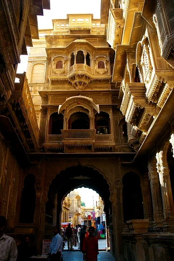 Built in 1156 by the Indian King Rawal Jaisal, the fort is on a site that legend says he chose on the advice of a wise local hermit. In the Indian epic poem the Mahabharata, the mystic tells Jaisal that the Hindu deity Lord Krishna had praised the spot—and therefore, a fort built there would be almost invisible to the king's enemies. Indeed, from 30 miles away, visitors see only a sheer golden cliff, rising nearly 25 stories from the desert floor. The walls, of rich yellow sandstone unique to Rajasthan's quarries, shimmer like a mirage.